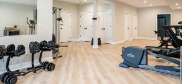 Entertainment & Wellness at Home Descending to the lower level feels like entering a private club. A home theater, gym, wet bar, and spa room provide spaces for both wellness and leisure. It’s the kind of lower level where weekends are easily spent without ever leaving home—whether you’re screening the latest release, indulging in a workout, or simply unwinding with friends over cocktails.