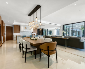 The residence was designed with both entertaining and everyday living in mind. Expansive indoor and outdoor gathering spaces allow for effortless hosting, whether for intimate family celebrations or larger social occasions. Generous sightlines and open layouts create a sense of flow, while natural light pours through the home, emphasizing its tranquil atmosphere.