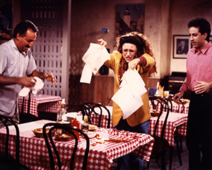 In a later episode of Seinfeld that I wrote “The Cafe”, we needed a secondary story… so, I used another experience from my old building. Years ago on West 11th Street a very pretty woman who lived on the top floor at the time had a job giving people IQ tests and she kept asking me to take one. I declined fearing I was even a bigger moron than she thought I was. So in that show I had George taking the test to impress another young lady. But like me he too was afraid of the results so he bribes Elaine to take it for him. This ends in disaster. In this episode I also introduced the character of Babu Bott, an East Indian café owner, who shakes his finger angrily at Jerry yelling, “You’re a bad man, Jerry! You are a very bad man!”
