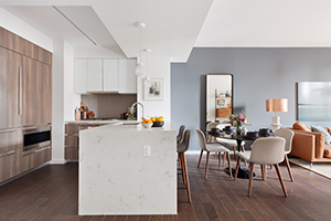 Open kitchen, dining, and living rooms are featured in all units utilizing a variety of materials. In the kitchens there are integrated cabinets on the Wolf and Sub Zero appliances with white frosted glass upper cabinets. There is a nice contrast with quartz backsplashes and counters. It is a nice multiple contrast of colors and textures. Except for studios, kitchen units have breakfast bars and wine fridges. Residents will find ample pantry space, a deep stainless steel sinks and Grohe fixtures.