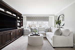 The home’s natural bright light and windows throughout set the scene for a muted and tonal color scheme, but the sisters wanted to ensure that each space didn’t fall flat. In the living spaces, for instance, sleek accent décor was added throughout including ottomans that could be easily-transitioned for entertaining or extra seating, along with coffee tables, mirrors, and artwork. The scale of each room was extremely important to the duo as well. Meghan and Erin always make sure to map out a floor plan to ensure that they can make the most out of a space without overwhelming or underwhelming the room. For example, in the TV viewing room, the duo incorporated an L-shaped sofa against the wall with a single ottoman and side table facing the built-in television. These choices allowed for a functional and comfortable room that wasn’t too overcrowded or busy.