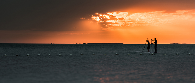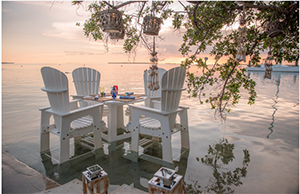 Relax or swim in the calm waters of the Florida Bay where wooden lounge chairs rest in the water, set up next to your beau with an island drink.