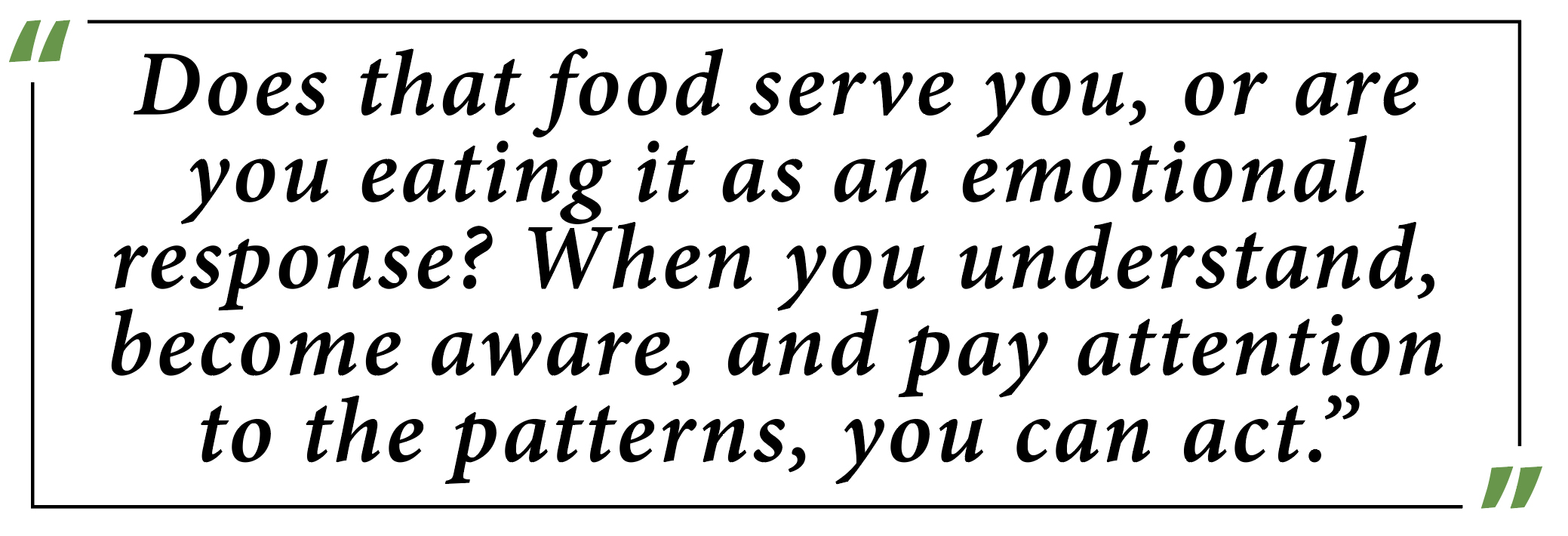 Once you understand that connection, you can then decide what it means to you and your body. Does that food serve you, or are you eating it as an emotional response? When you understand, become aware, and pay attention to the patterns, you can act.