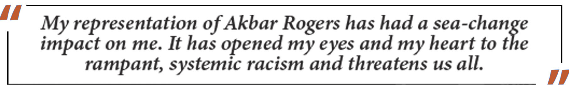 My representation of Akbar Rogers has had a sea-change impact on me. It has opened my eyes and my heart to the rampant, systemic racism and threatens us all. It has drawn me into seeing that people of color are treated differently—that they are seen first by their skin color. And that is horrifying. I understand the importance of doing all that I can to get us to a place where we all demand that justice be delivered. And that should certainly include being colorblind.
