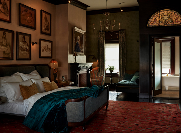 Glazman and Roytberg partnered with hospitality expert Damien Janowicz in developing The Maker, which they describe as “a curated sanctuary with bohemian sensibilities.” Working with a global group of artisans, artists, craftsmen, and builders, they preserved many elements of the 14,000-square-foot property, including ornate fireplaces in guest rooms, wood floorings, decorative stained glass, foyer mosaic tiles, and hand-painted ceilings to create an otherworldly experience—one that bends time from past to present.