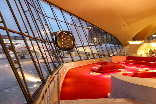 No matter where you stand in TWA Hotel today, the iconic Chili Pepper Red—the fiery hue Saarinen made famous in the Flight Center—is highlighted throughout from the upholstery in the Sunken Lounge to the carpeting. The hue makes it perfect for a romantic Valentine’s getaway night with a retro 1960s flair. Consisting of two wings, many of the 512 guestrooms look out onto the runways. Of special note: seven layers of soundproof glass assures your sleep will not be interrupted. The hotel is also perfect for spending a night before you take off for a romantic beachside weekend in the Caribbean or a European getaway. JetBlue’s Terminal 5 is next door and can be easily accessed by elevator.