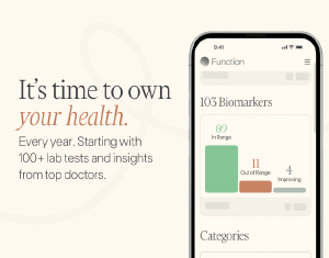 Take charge of your health in 2025. Function includes access to over one hundred lab tests, to track overall health--from heart and hormones to thyroid, nutrients, toxins, autoimmunity, immunity, and beyond. The annual subscription flips the healthcare script from reactive to proactive and includes actionable insights. Info: functionhealth.com