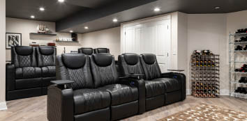 Entertainment & Wellness at Home Descending to the lower level feels like entering a private club. A home theater, gym, wet bar, and spa room provide spaces for both wellness and leisure. It’s the kind of lower level where weekends are easily spent without ever leaving home—whether you’re screening the latest release, indulging in a workout, or simply unwinding with friends over cocktails.