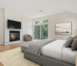 The primary suite is perhaps where the home’s personality shines brightest. A double-sided fireplace offers a gentle glow that flickers between the bedroom and spa bath, creating an atmosphere that’s almost cinematic. The steam shower, radiant heated floors, and private balcony make it easy to imagine long winter mornings spent lingering in comfort.