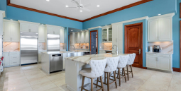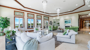The 12,789-square-foot layout invites both grand entertaining and private retreat. The chef’s kitchen, fitted with Sub-Zero and Wolf appliances, dual islands, and a wine fridge, opens to elegant dining and living areas designed for flow and connection. The primary suite is a sanctuary unto itself—complete with a screened terrace, spa-like bath, and sweeping bay views—while guest suites with private balconies echo the same thoughtful serenity.