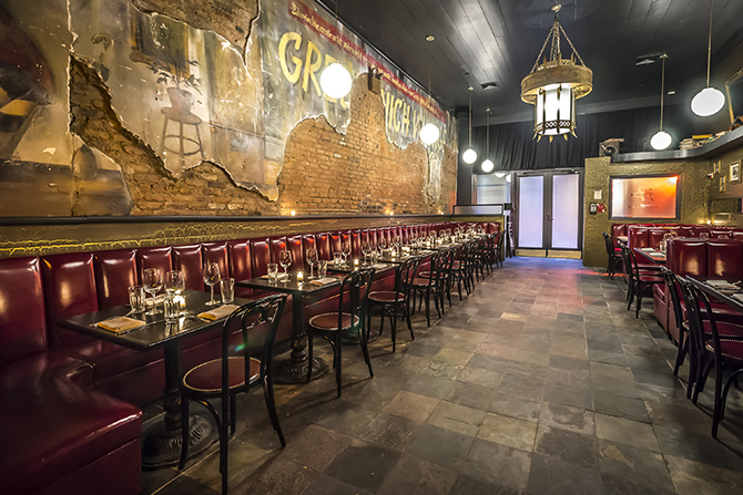 The newly opened restaurant boasts a high ceiling held up on both sides by large sweeping walls—one of which features a mural from the book Greenwich Village Girl. In one corner, you can spot a pinup version of the novel’s lead character, “Suzy,” after which one of their most favorite cocktails Suzy’s Secret is named. The opposite wall is coated in ebony black and forest green crackle paint and bedecked with black and white photos of original icons from 1950s Greenwich Village.